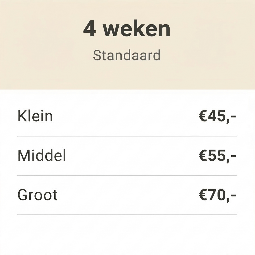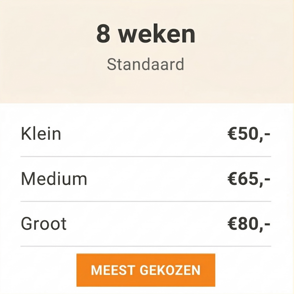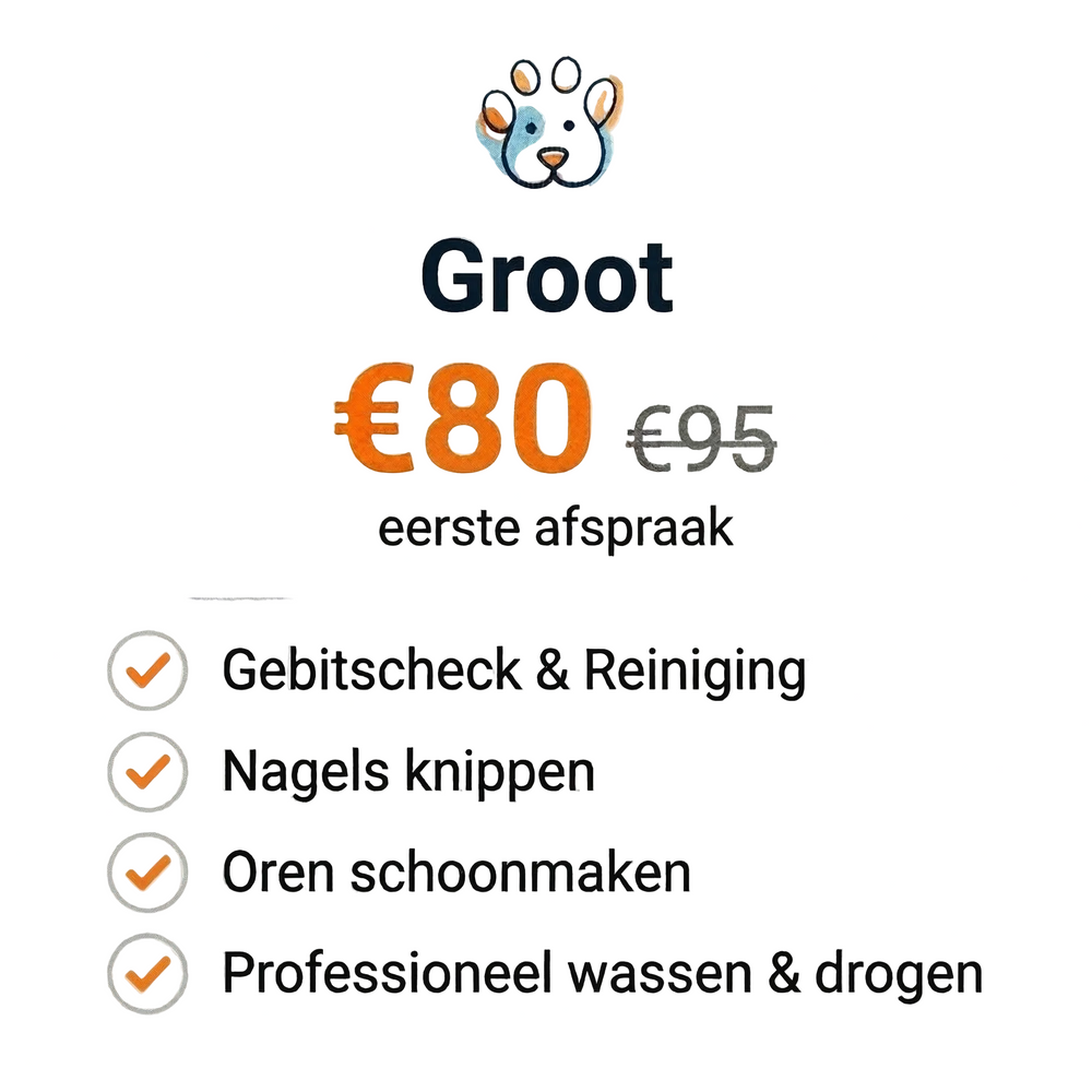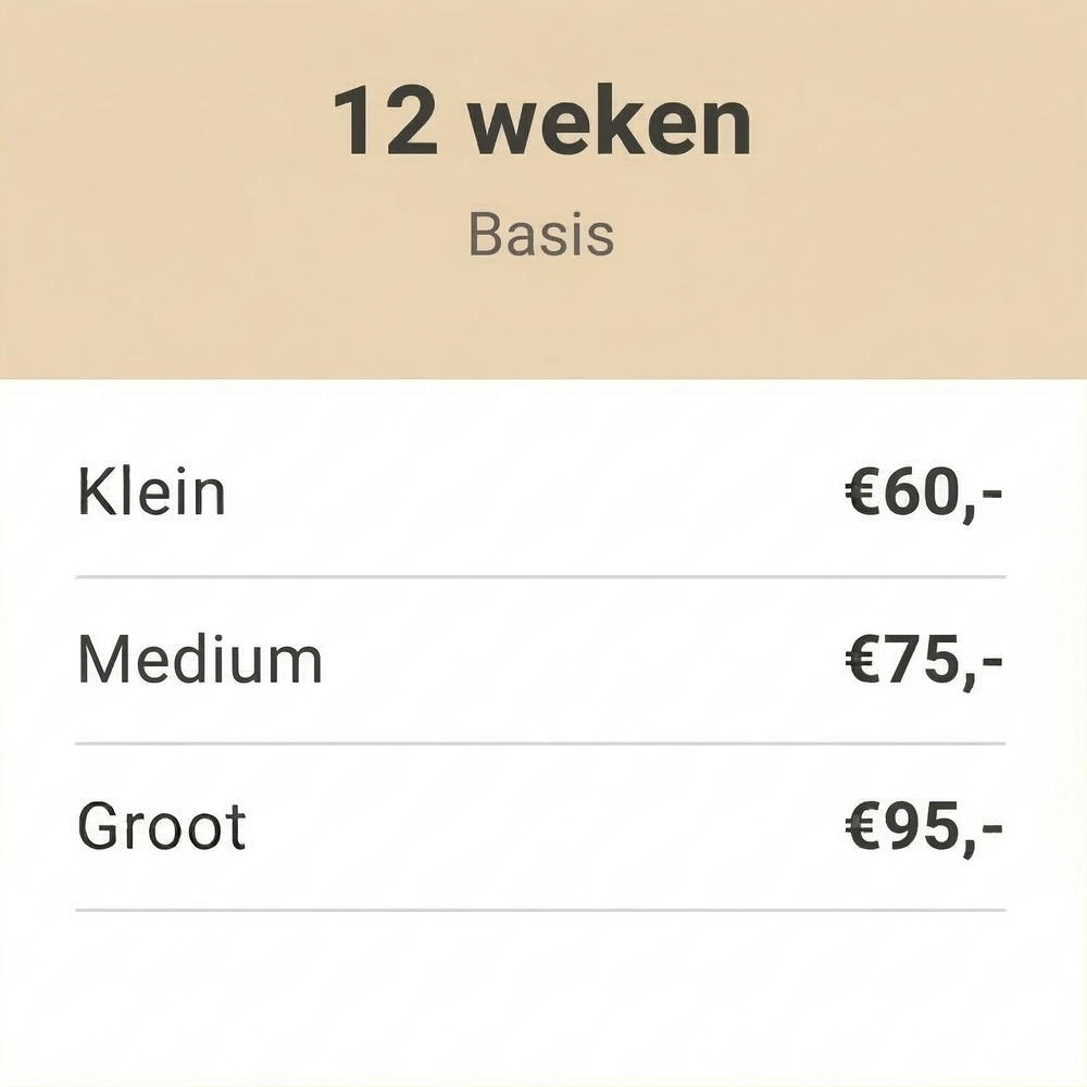 Wij hanteren de volgende richtlijnen op basis van gewicht en ras: Klein (S): Tot 10 kg (Bijv. Boomer, Jack Russel, Maltezer, Dwergkees) Middel (M): 10 tot 25 kg (Bijv. Cocker Spaniel, Beagle, Franse Bulldog, Border Collie) Groot (L): 25 tot 40 kg (Bijv. Labrador, Golden Retriever, Boxer, Doodle Medium/Large) Heeft u een XL hond (zoals een Berner Sennen of Newfoundlander)? Neem dan even contact op voor een tarief op maat.