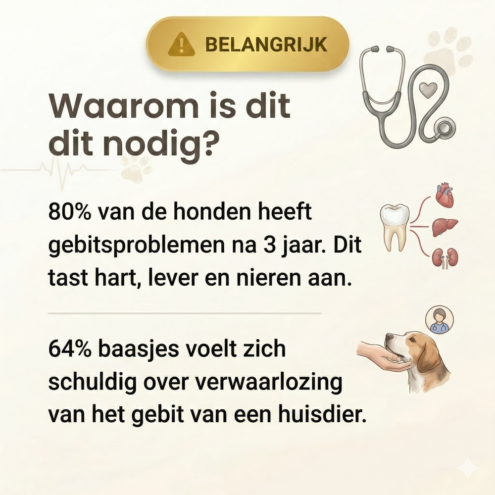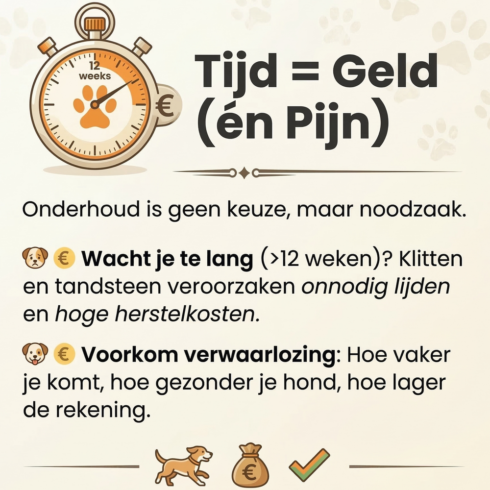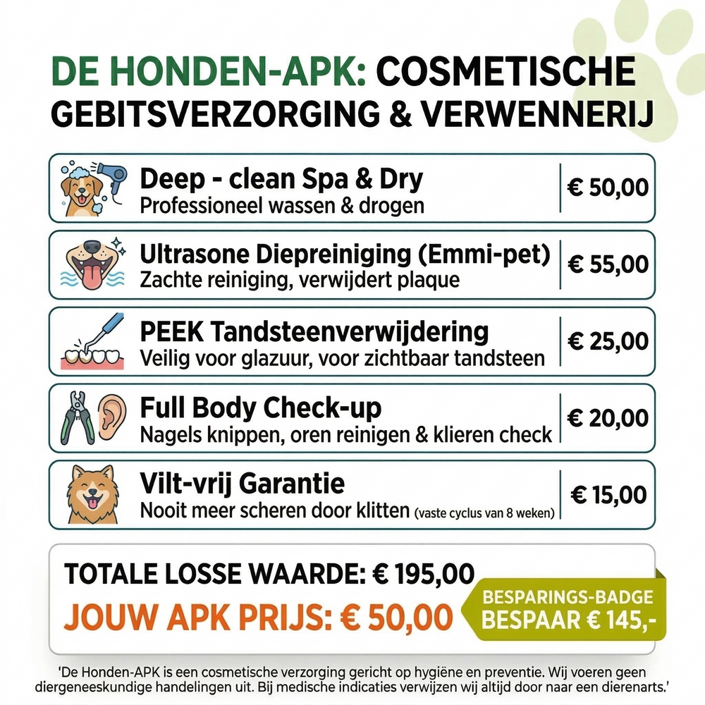 Preventie is de beste (en voordeligste) zorg. Als een gebit verwaarloosd raakt, is een medische reiniging onder narcose bij de dierenarts noodzakelijk. Met eventuele extracties en medicatie lopen die kosten al snel op richting de €600+. Met onze cosmetische APK (€50) houden we het gebit veilig en pijnloos schoon met ultrasone trillingen. Door tandplak en beginnend tandsteen structureel te verwijderen, verklein je de kans op ernstige gebitsproblemen drastisch en bespaar je jouw hond vaak een zware, dure ingreep. Voor het allerbeste, blijvend schone resultaat adviseren wij een behandeling elke 4 weken, maar een frequentie van elke 8 weken is ook voldoende als structureel onderhoud.
