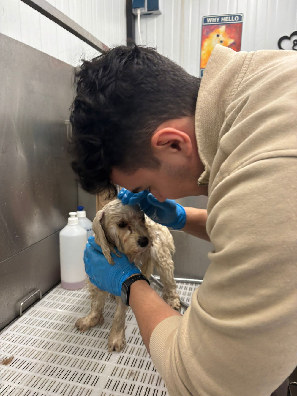 Geen zorgen, wij werken met de "Dubbele Aandacht" methode. Terwijl één specialist de hond liefdevol vasthoudt en knuffelt, focust de ander zich op de behandeling. 95% van de honden (ook angstige) laat dit rustig toe. Lukt het écht niet? Dan betaalt u niet.